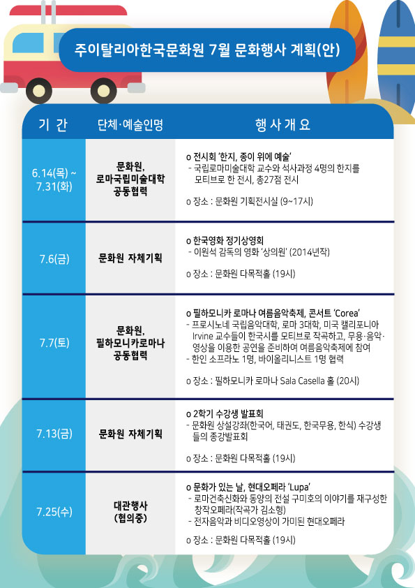 주이탈리아한국문화원 18.7월 문화행사 계획