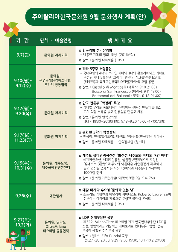 주이탈리아한국문화원 2018.9월 문화행사 계획(안)