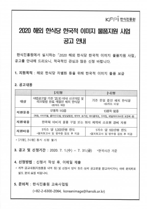 2020 해외 한식당 한국적 이미지 물품지원 사업 공고 안내