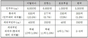 ▲ 국회 입법조사처가 조사한 '한국과 외국의 재외국민대표 의석수 비율' 비교 표. 괄호 속 ca.는 잠정 추산치 의미(제공=김종갑 입법조사처 박사) 포르투갈은 총인구 1000만 명 중 총의석은 230석(23%)이며 4석을 재외국민에게 할당해 비율은 1.7%로 집계되고 있다. 포르투갈의 재외국민은 46만 명이다.