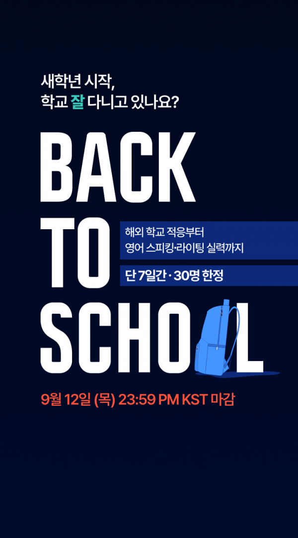 안녕하세요, 10대를 위한 화상영어 링글 틴즈팀입니다! 새학기, 해외학교 생활에 완벽히 적응하고 대비할 수 있도록 <Back to school> 이벤트를 준비했습니다. [~9/12(목)]