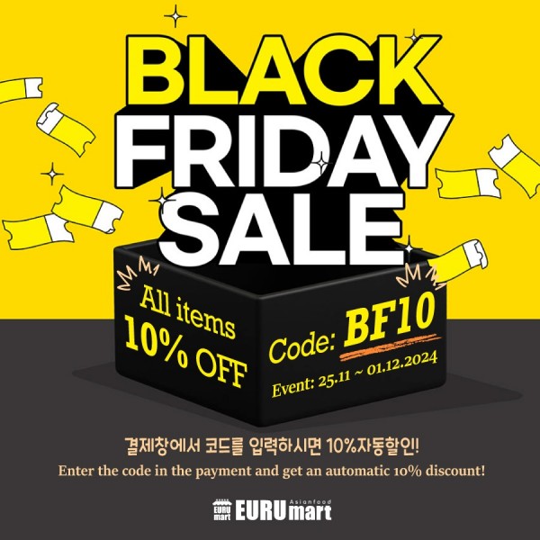 안녕하세요. 독일 온라인 한인마트 유루마트입니다. 저희 유루마트에서는 블랙프라이데이를 기념하여 다음주 11월25일 월요일부터 12월 1일까지 일주일간 전품목 10프로 할인 행사를 할예정입니다.