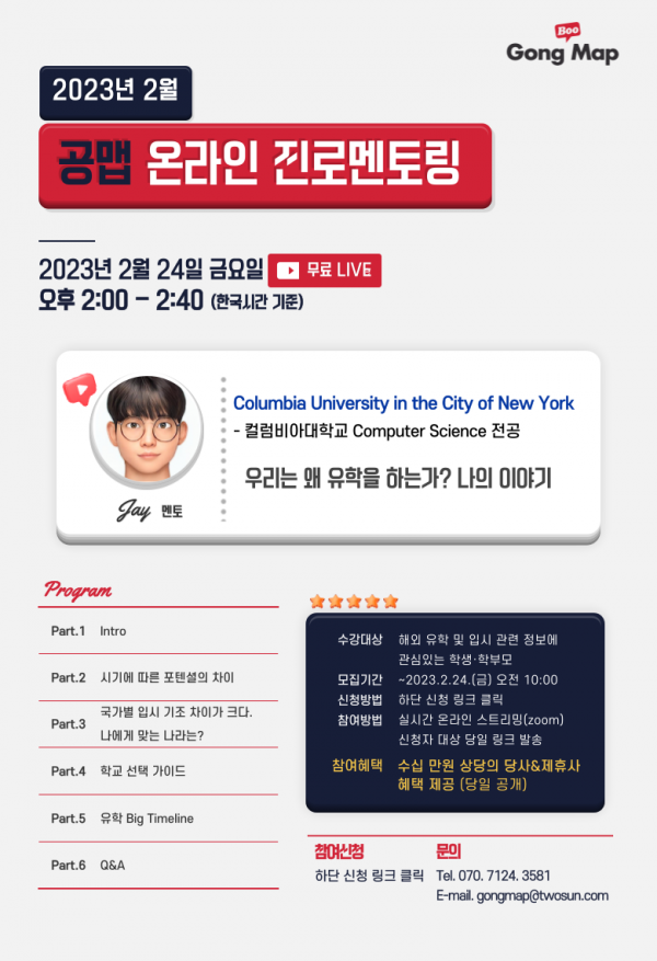 공맵 '컬럼비아 대학교' 유학선배 온라인 진로멘토링 신청(~2/24)