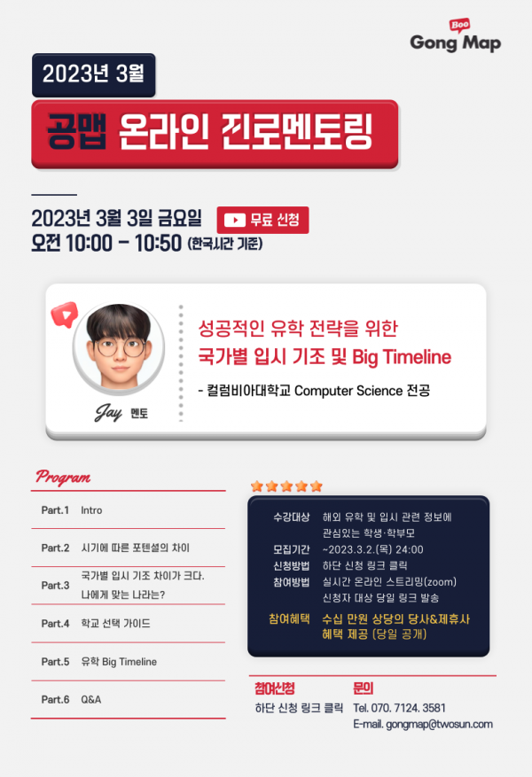 [앵콜멘토링] 공맵 3월 온라인 진로멘토링 '성공적인 유학 전략' 신청(~3/2)