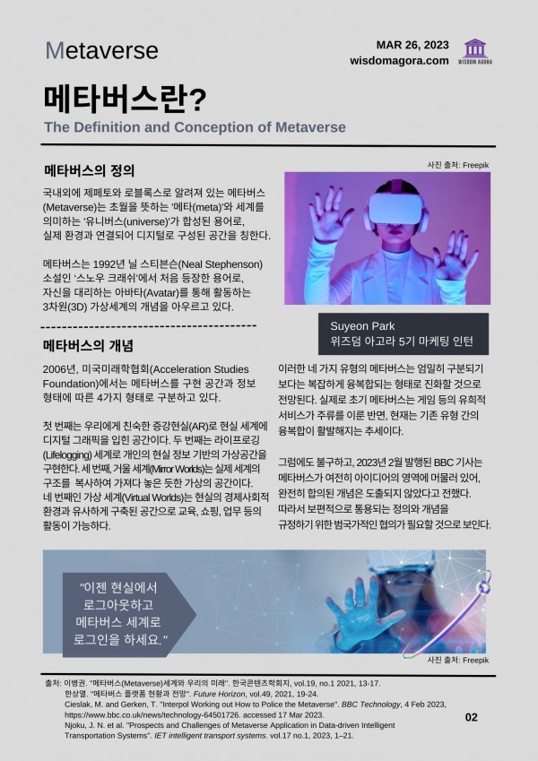 ✔️3월 호: METAVERSE: A Virtual-Reality Space (https://wisdomagora.com/magazine-2023%eb%85%84-03%ec%9b%94-%ed%98%b8-metaverse-a-virtual-reality-space/)