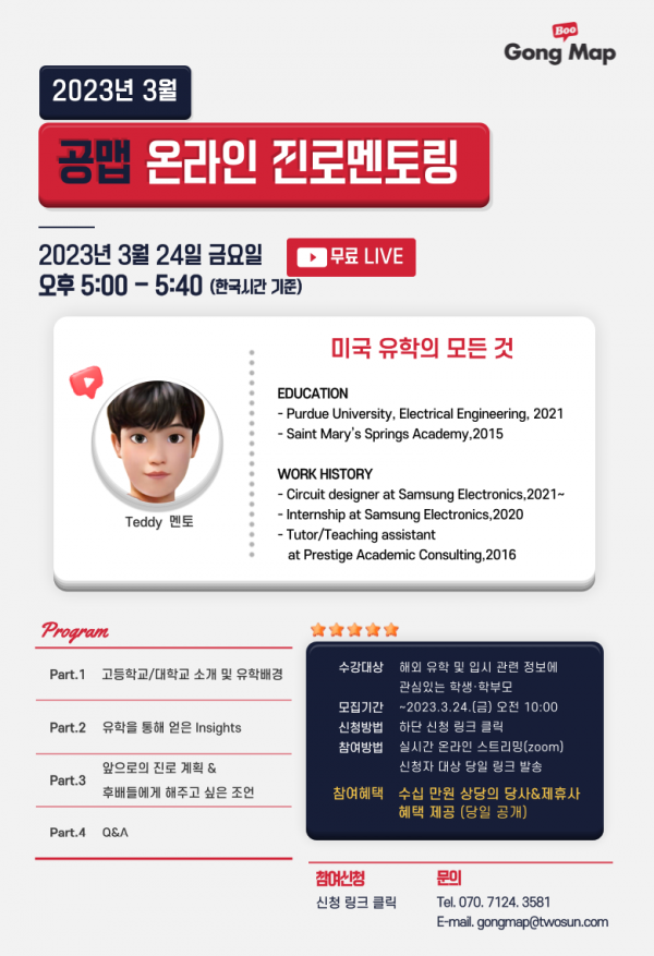 공맵 온라인 진로멘토링 '미국 유학의 모든 것' 무료live 신청(~3/24)