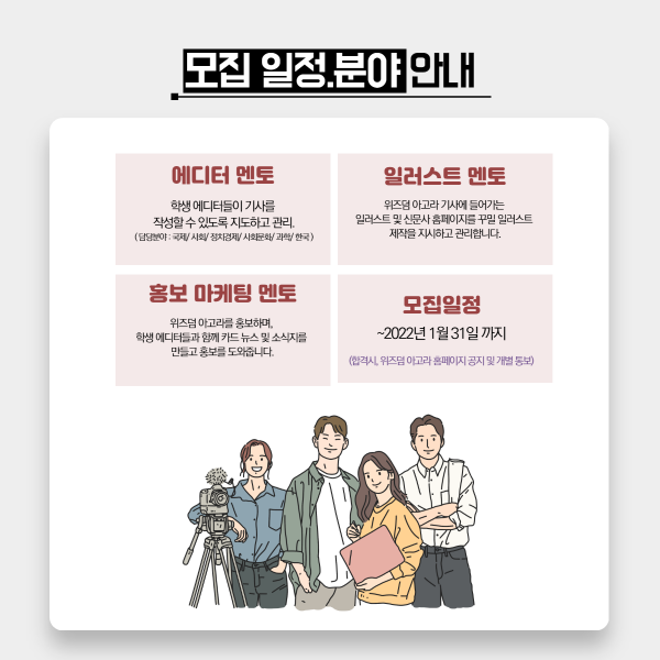 3. 홍보 마케팅 멘토 : 위즈덤 아고라를 홍보하며, 학생 에디터들과 함께 카드 뉴스 및 소식지를 만들고 홍보를 도와줍니다.