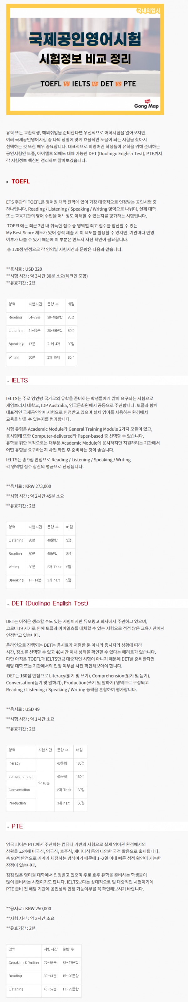 [국내외입시]국제공인영어시험 시험정보 비교정리! (TOEFL,IELTS,DET,PTE)