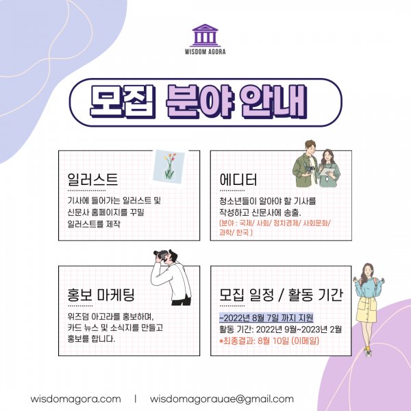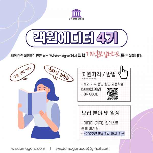 Wisdom Agora는 해외에서 국제 학교를 졸업하고 대학생이 된 학생들이 만든 온라인 신문사로 해외 한인 학생들이 만든 기사, 일러스트, 미디어를 통해 함께 생각을 나누고자 만든 공간입니다. 국제적인 네트워킹과 시각의 다양성을 위해 각국을 대표할 객원 에디터를 모집합니다.