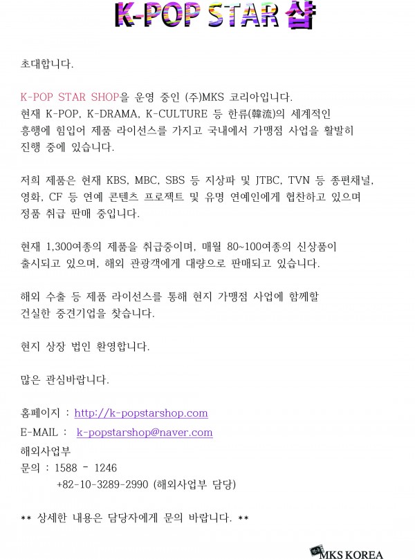 K-POP STAR SHOP을 운영 중인 (주)MKS 코리아입니다.