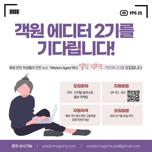 Wisdom Agora는 해외에서 국제 학교를 졸업하고 대학생이 된 학생들이 만든 온라인 신문사로 해외 한인 학생들이 만든 기사, 일러스트, 미디어를 통해 함께 생각을 나누고자 만든 공간입니다. 국제적인 네트워킹과 시각의 다양성을 위해 각국을 대표할 객원 에디터를 모집합니다.