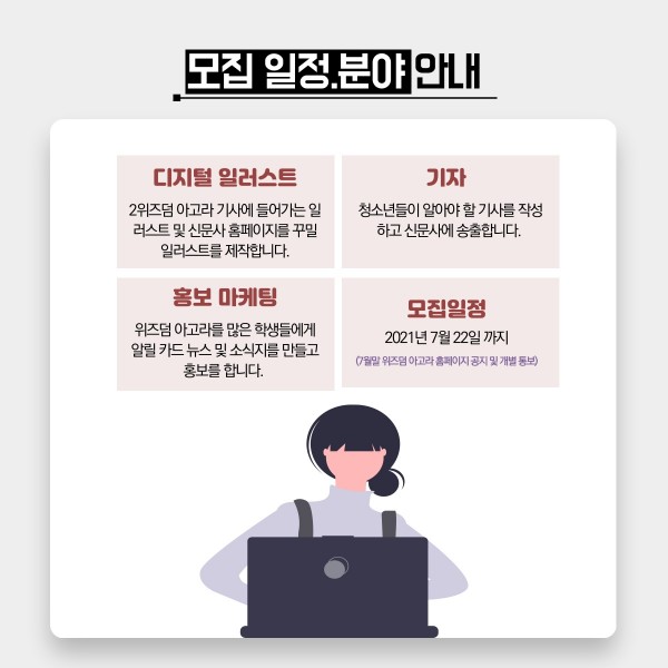 2. 일러스트 : 위즈덤 아고라 기사에 들어가는 일러스트 및 신문사 홈페이지를 꾸밀 일러스트를 제작합니다. ( 단, 응모원서에 일러스트 업로드필요, 주제는 자유입니다.)