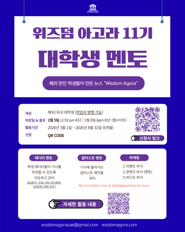 WISDOM AGORA는 해외에서 국제 학교를 졸업하고 대학생이 된 학생들이 만든 온라인 신문사로 한인 고등학생들이 만든 기사, 일러스트, 미디어를 통해 함께 생각을 나누는 공간입니다.