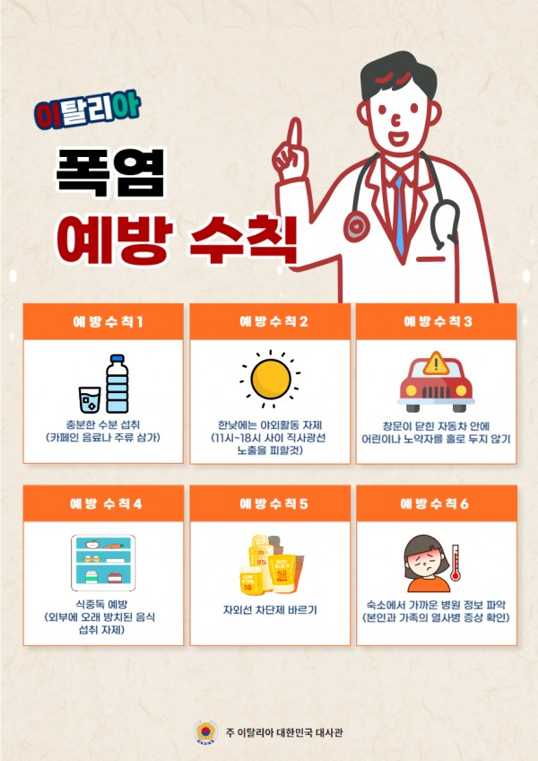 이탈리아 전역에 폭염이 발생하고 있어, 이탈리아에 거주 또는 관광하시는 우리 국민들의 주의가 요구됩니다.