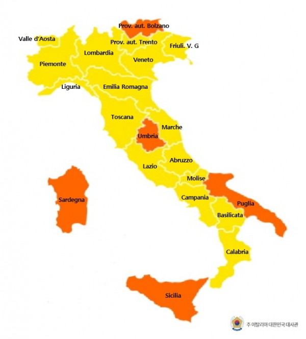 ● Zona Arancione (Orange Zone) : 시칠리아(Sicilia), 사르데냐(Sardegna), 움브리아(Umbria), 풀리아(Puglia), 볼차노(Provincia Autonoma di Bolzano)