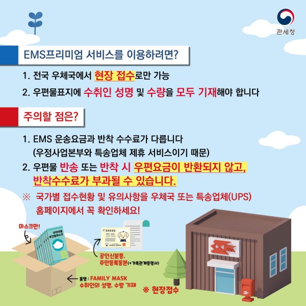 EMS프리미엄 서비스를 통한 마스크 발송은 전국 우체국에서 현장접수로만 이용이 가능하며, 코로나19의 영향으로 배송 지연 · 관세 · 반착수수료 등이 부과될 수 있다고 하니, 발송 전 반드시 아래 우체국 콜센터에 관련 사항을 문의하신 후 진행하시기를 권장드립니다.