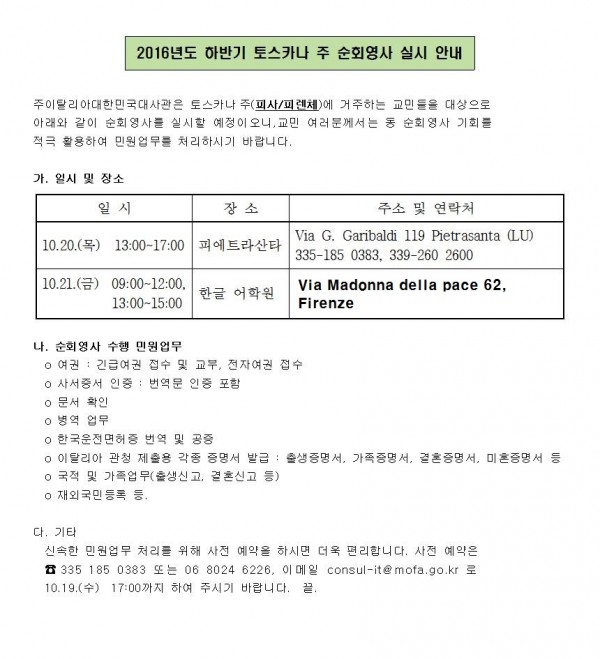 2016년도 하반기 토스카나 주 순회영사 실시 안내