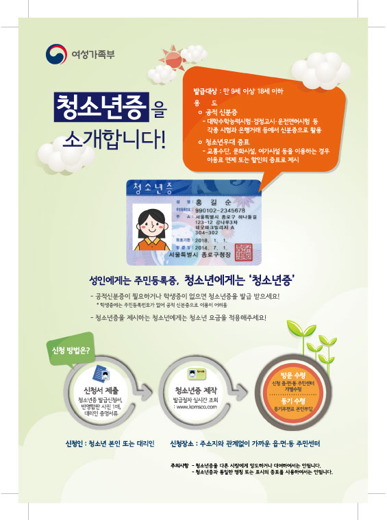 여성가족부는 만 9세 이상 18세 이하 청소년을 대상으로 발급하는 ‘청소년증’ 제도를 운영하고 있습니다.