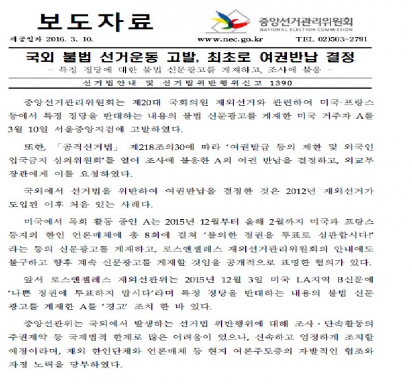 제20대 국회의원 재외선거 위법행위 보도자료