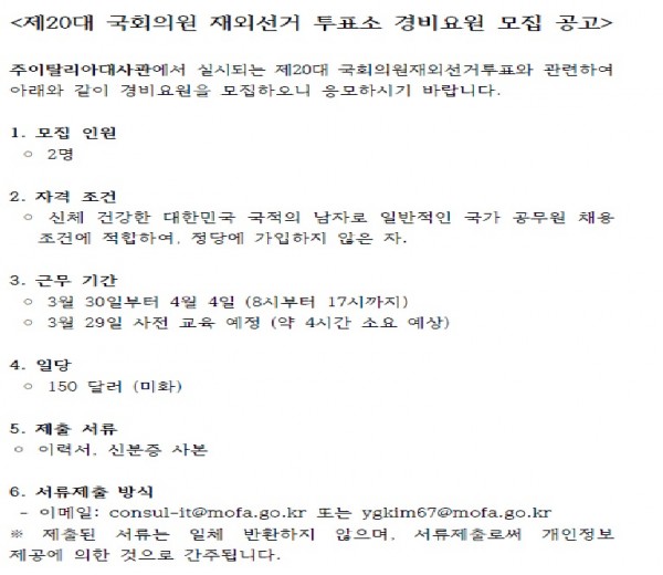 제20대 국회의원 재외선거 투표소 경비요원 모집 공고