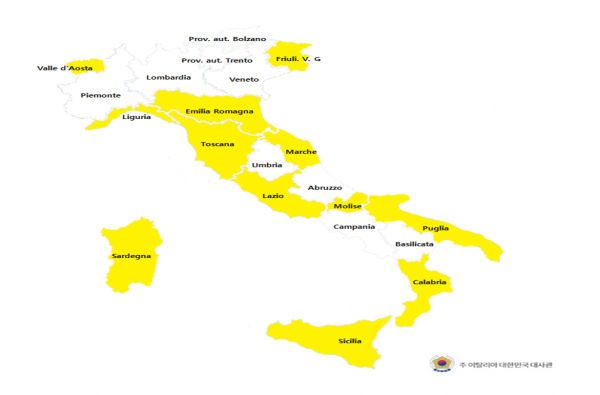 ● Zona Gialla(Yellow Zone) : 라치오(Lazio), 풀리아(Puglia), 사르데냐(Sardegna), 칼라브리아(Calabria), 토스카나(Toscana), 몰리세(Molise), 시칠리아(Sicilia), 마르케(Marche), 발레다오스타(Valle d'Aosta), 에밀리아로마냐(Emilia-Romagna), 리구리아(Liguria), 프리울리베네치아줄리아(Fruili Venezia Giulia)