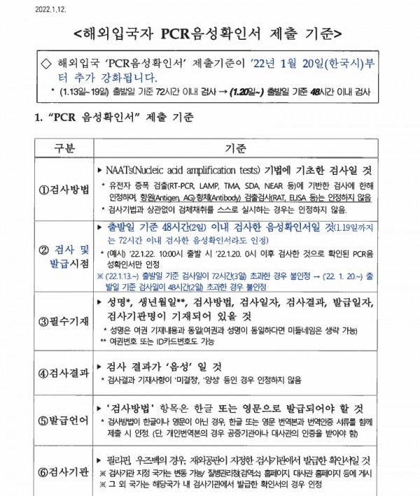 변경 : 출발일 기준 48시간(2일) 이내 검사한 PCR음성확인서