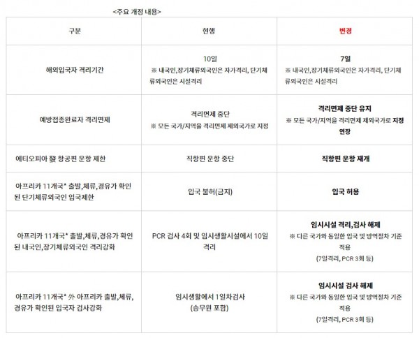 국내 중앙방역대책본부는 2022년 2월 3일까지 한시적으로 시행 예정이던 오미크론 변이 바이러스 대응 관련 입국제한 등 강화된 방역조치를 변이 바이러스의 우세종화 및 국내/외 방역상황 등을 종합적으로 고려하여, 아래와 같이 변경한다고 알려왔으니 재외국민분들께서는 한국 입국시 참고하시기 바랍니다.