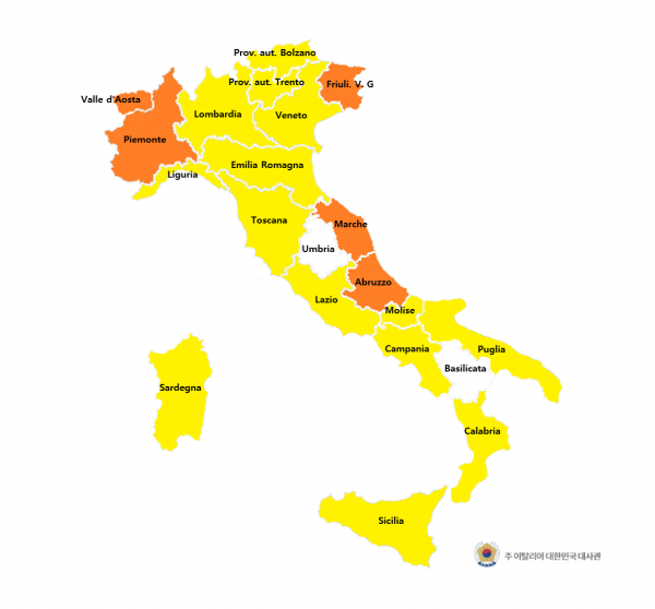 ● Zona Arancione(Orange Zone) : 아브루초(Abruzzo), 마르케(Marche), 발레다오스타(Valle d'Aosta), 프리울리베네치아줄리아(Fruili Venezia Giulia), 피에몬테(Piemonte)