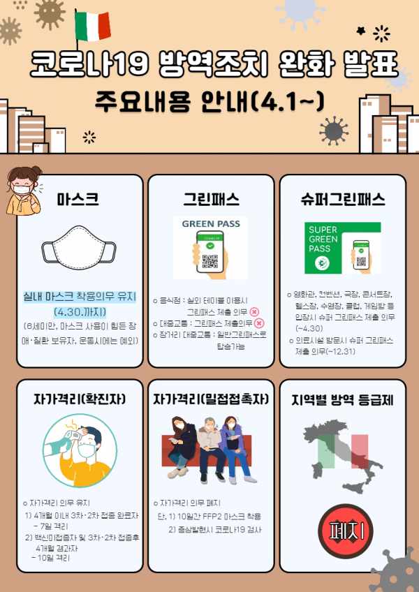 ㅇ 4.1.부터 이탈리아내 장거리 대중교통(국내선 항공기, 기차, 배 등) 이용시 기존 슈퍼 그린패스 제출 대신 일반 그린패스로 탑승 가능