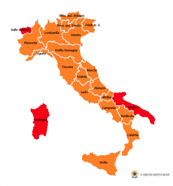 ● Zona Arancione (Orange Zone) : 캄파니아(Campania), 라치오(Lazio), 칼라브리아(Calabria), 토스카나(Toscana), 롬바르디아(Lombardia), 에밀리아 로마냐(Emilia Romagna), 프리울리 베네치아 줄리아(Friuli Venezia Giulia), 피에몬테(Piemonte), 마르케(Marche), 베네토(Veneto), 트렌토 자치도(Provincia Autonoma di Trento), 몰리세(Molise), 아브루초(Abruzzo), 리구리아(Liguria), 시칠리아(Sicilia), 움브리아(Umbria), 바실리카타(Basilicata), 볼차노 자치도(Provincia Autonoma di Bolzano)