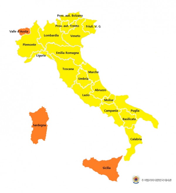 ● Zona Arancione (Orange Zone) : 시칠리아(Sicilia), 사르데냐(Sardegna), 발레다오스타(Valle d'Aosta)