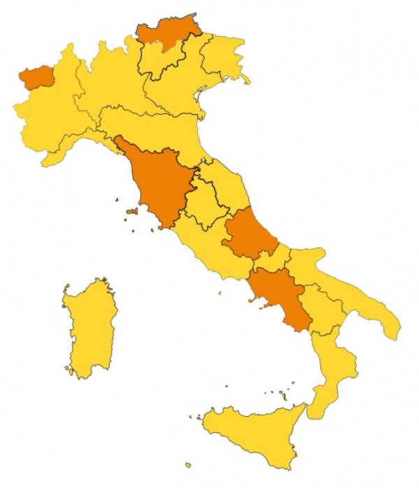 Zona Arancione (Orange Zone) : 아브루초(Abruzzo), 토스카나(Toscana), 캄파니아(Campania), 볼차노(Provincia di Bolzano), 발레다오스타(Valle d'Aosta)