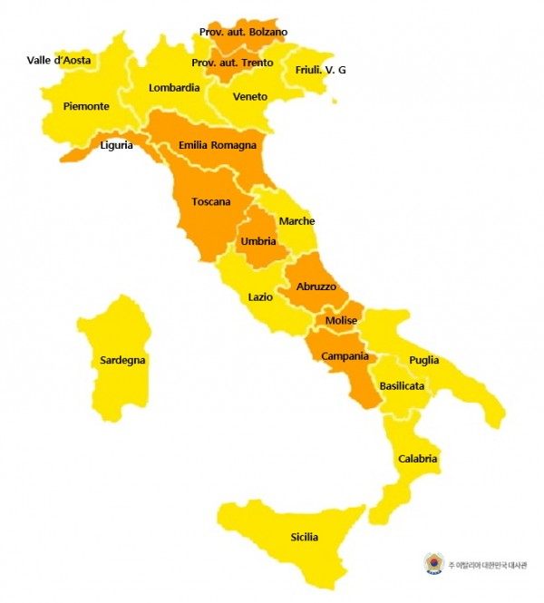 ● Zona Arancione (Orange Zone) : 아브루초(Abruzzo), 캄파니아(Campania), 에밀리아 로마냐(Emilia Romagna), 리구리아(Liguria), 몰리세(Molise), 토스카나(Toscana), 볼차노(Provincia Autonoma di Bolzano), 트렌토(Provincia Autonoma di Trento), 움브리아(Umbria)