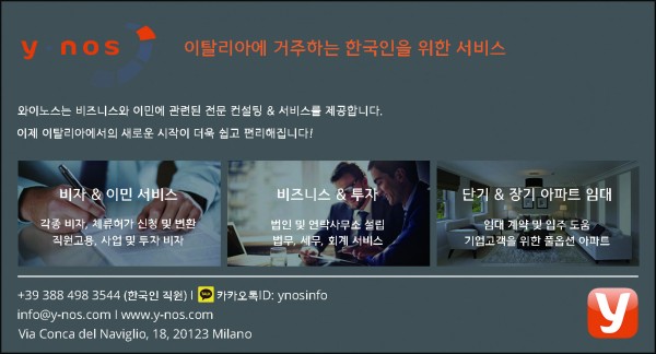 와이노스는 이탈리아에 유학, 비즈니스, 이민 등의 목적으로 오시는 개인 및 법인에게 유용한 여러 서비스를 제공합니다. 본사는 밀라노에 있으며 현재 유럽의 다양한 도시에 서비스를 제공하고 있습니다.