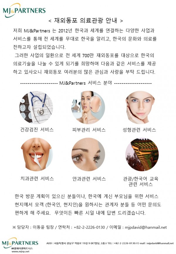 한국에서 의료관광사업을 진행하고 있는 (주)엠제이앤파트너스 입니다.