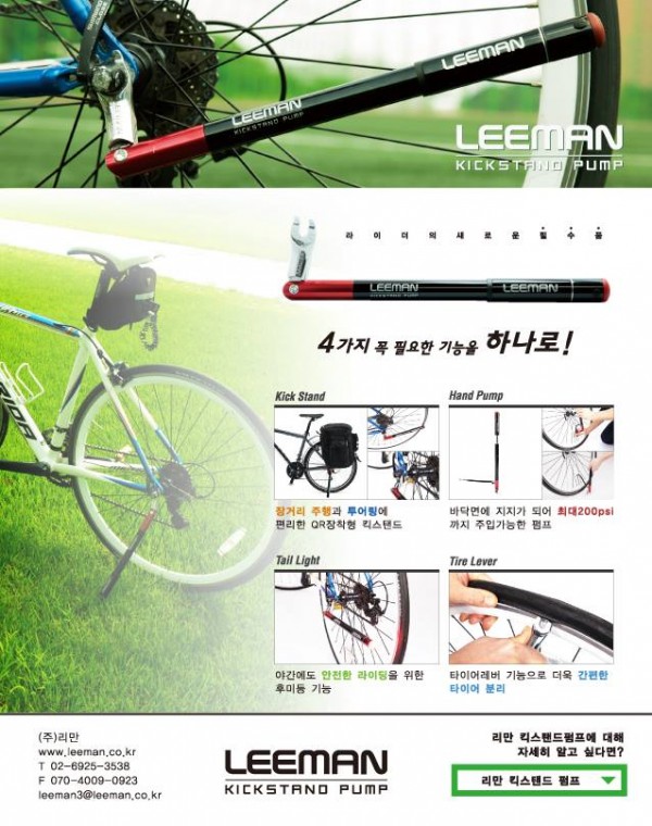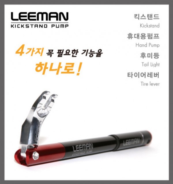 자전거받침대인 킥스탠드와 휴대펌프 그리고 후미등과 타이어레버까지 총 4가지를 하나로 합친 특허상품입니다.