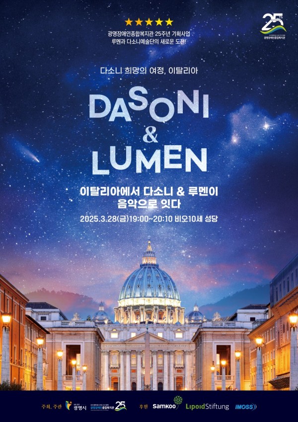 안녕하세요. 광명장애인종합복지관 측에서 주최로 대한민국 최초 장애인 예술단인 다소니 장애인 예술단의 이탈리아 로마 공연 일정을 홍보합니다.